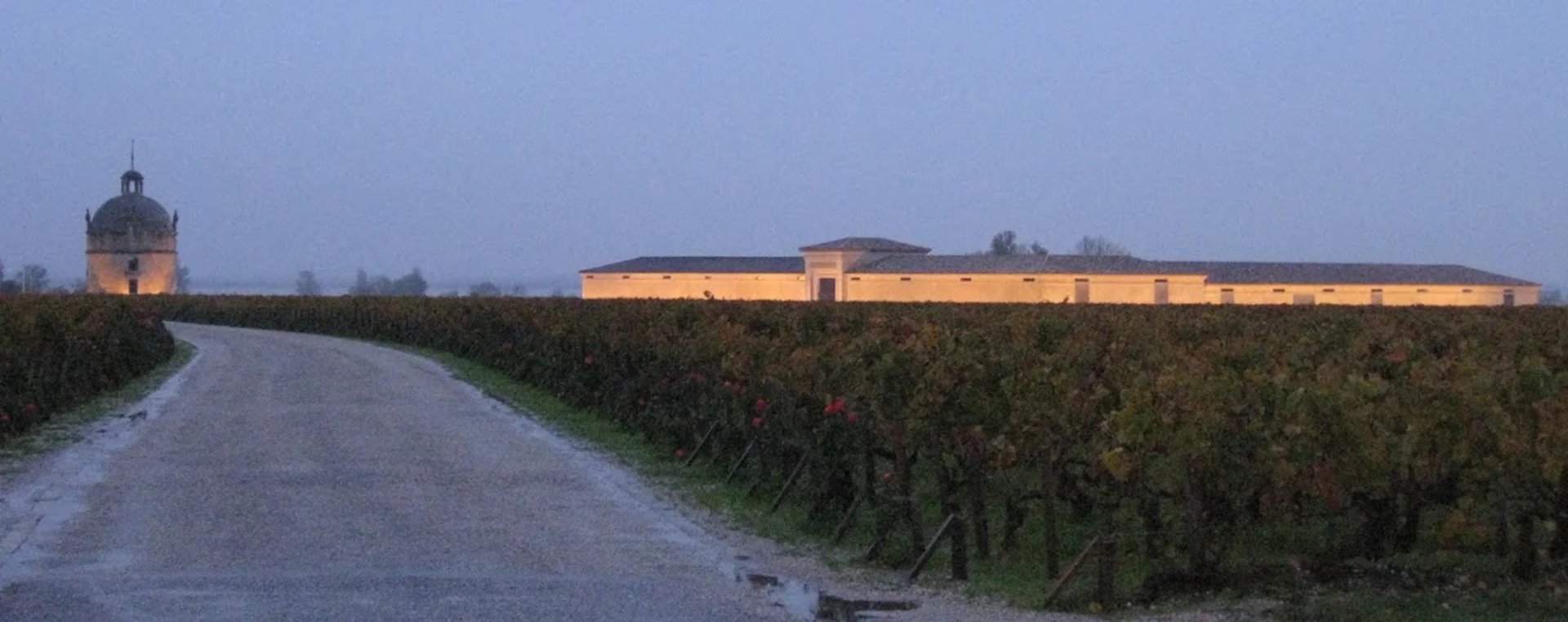 2008年11月5日、雨上がりの薄暮。私はサン・ジュリアン村との境界に近い公道から、このカメラにラトゥールの姿を収めた。ブドウ畑「ランクロ」を貫く一本道、灯されたシャイ(醸造庫)、そして名の由来となった石造りの塔「サン・モーベールの塔(La Tour de Saint-Lambert)」が夕闇に浮かび上がる。