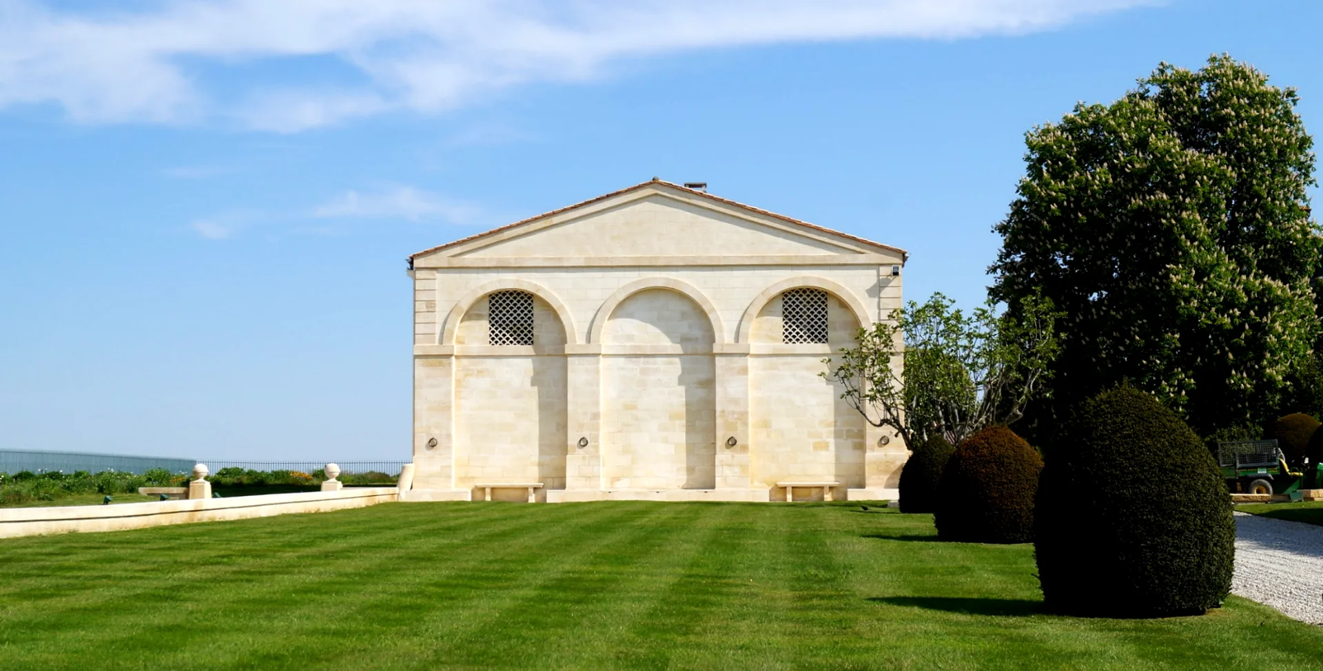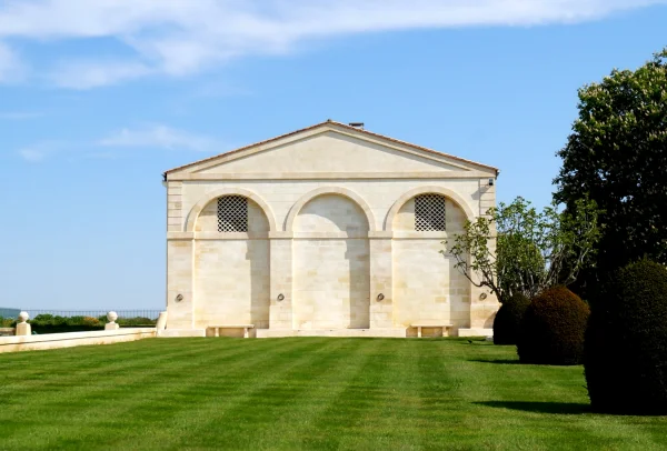写真は、シャトー敷地内に建つ新古典主義様式のパヴィリオン「Le Petit Mouton」。三連アーチと古典的なペディメントが印象的で、春の芝生と青空に映える佇まいは、ムートンが体現する「格調」と「革新」の象徴です。