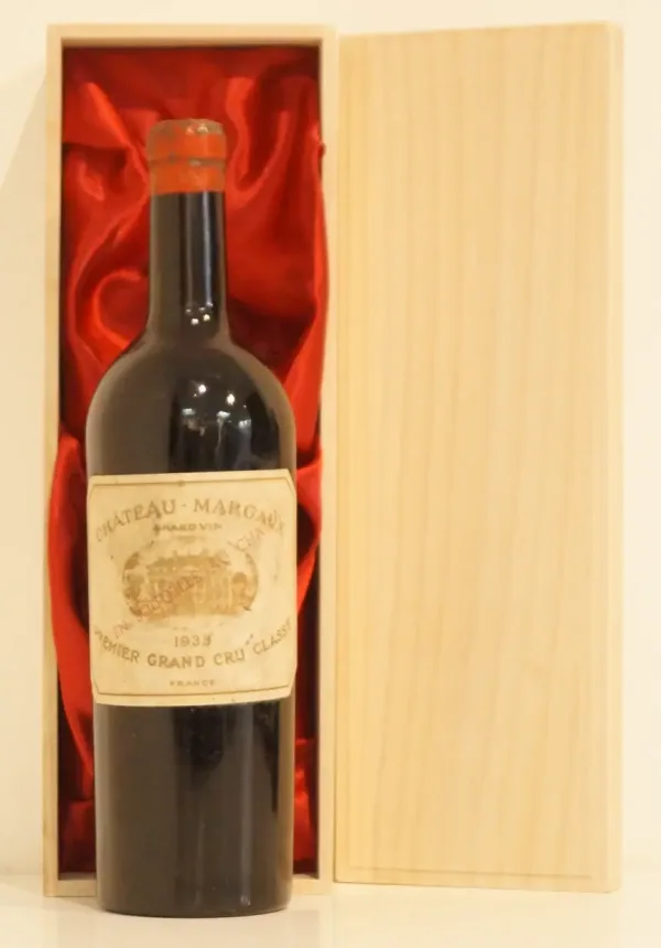 1933年 フランス産1933年 シャトー・マルゴーのヴィンテージワイン。贈り物やギフトに最適な、格調高い生まれ年ワインです。大切にされたボトル入りのお花が箱に包まれた本品は、特別な贈り物としてきっと喜ばれます。