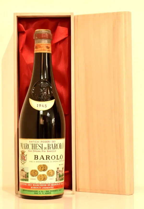 1945年 イタリア産1945年 バローロ マルケージ・ディ・バローロのヴィンテージワイン。贈り物やギフトに最適な、格調高い生まれ年ワインです。大切にされたボトル入りのお花が箱に包まれた本品は、特別な贈り物としてきっと喜ばれます。