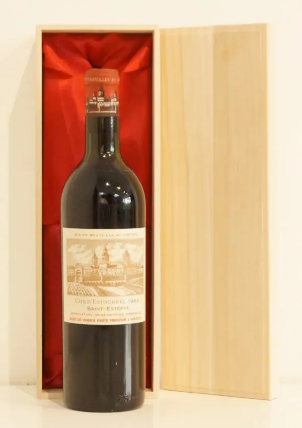 1963年 フランス産1963年 シャトー・コス・デストゥルネルのヴィンテージワイン。贈り物やギフトに最適な、格調高い生まれ年ワインです。大切にされたボトル入りのお花が箱に包まれた本品は、特別な贈り物としてきっと喜ばれます。