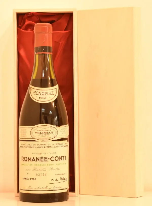 1963年 フランス産1963年 DRC ロマネ・コンティのヴィンテージワイン。贈り物やギフトに最適な、格調高い生まれ年ワインです。大切にされたボトル入りのお花が箱に包まれた本品は、特別な贈り物としてきっと喜ばれます。