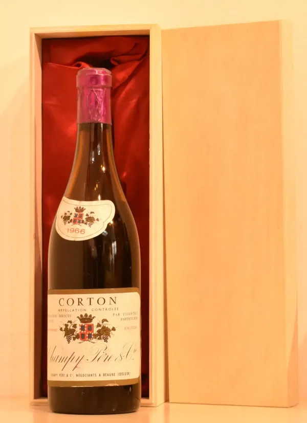 1966年 フランス産1966年 シャンピーコルトン 赤(②液面低い)のヴィンテージワイン。贈り物やギフトに最適な、格調高い生まれ年ワインです。大切にされたボトル入りのお花が箱に包まれた本品は、特別な贈り物としてきっと喜ばれます。
