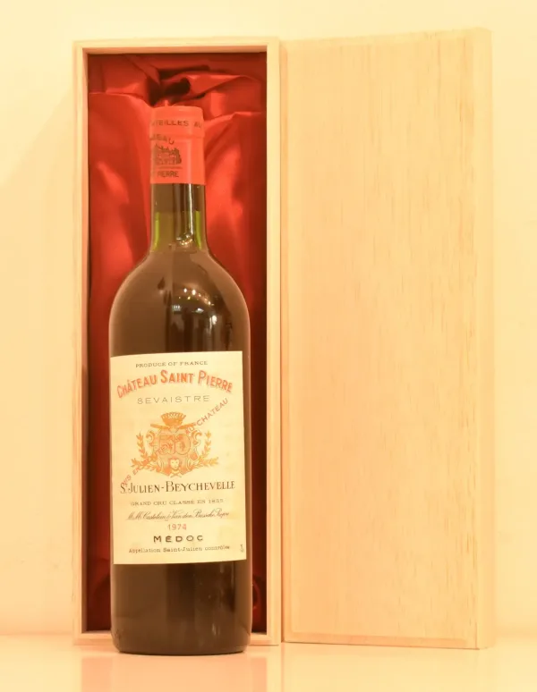 1974年 フランス産1974年 シャトー・サン・ピエールのヴィンテージワイン。贈り物やギフトに最適な、格調高い生まれ年ワインです。大切にされたボトル入りのお花が箱に包まれた本品は、特別な贈り物としてきっと喜ばれます。
