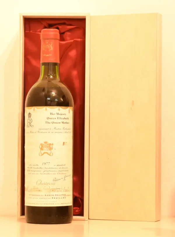 1977年 フランス産1977年 シャトー・ムートン・ロートシルトのヴィンテージワイン。贈り物やギフトに最適な、格調高い生まれ年ワインです。大切にされたボトル入りのお花が箱に包まれた本品は、特別な贈り物としてきっと喜ばれます。