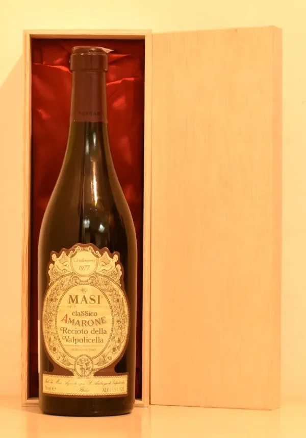 マアジMasiは、1772年にボスカイーニ家がヴァルポリチェッラ・クラシコ地区に設立した老舗ワイナリー。200年以上の歴史を持ち、60haの自社畑でコルヴィーナ主体のワインを生産。アパッシメント製法の先駆者として、アマローネの名声を高めた。アマローネ・レチョートは甘口のレチョートを基に、発酵を進めて辛口に仕上げた特別なスタイルで、1977年はマアジの技術力が光る年。2018年にガンベロ・ロッソで「ワイナリー・オブ・ザ・イヤー」を受賞し、国際的な評価も高いでです。