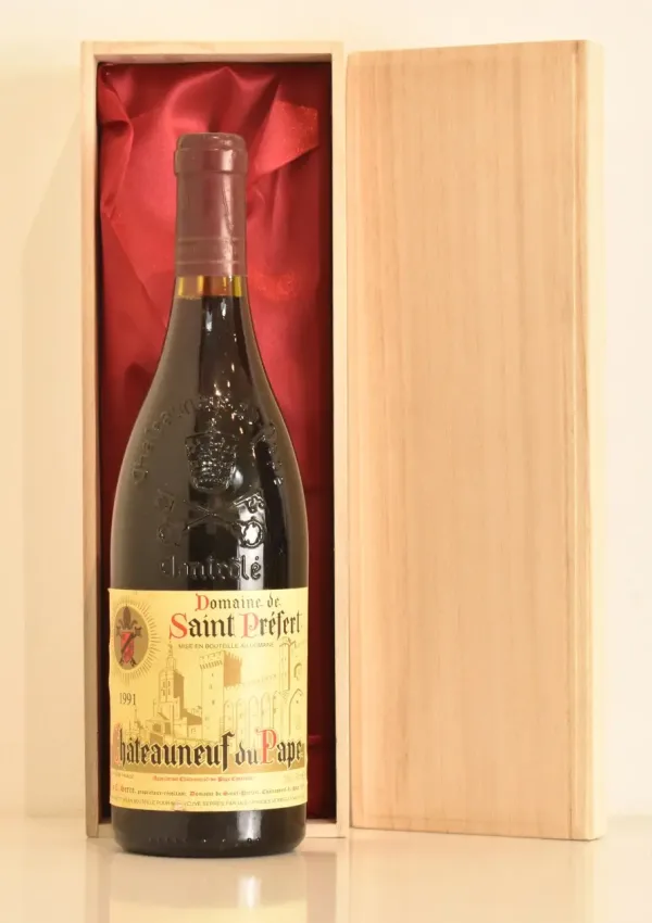 1991年 フランス産1991年 シャトーヌフ・デュ・パープ ドメーヌ・サン・プレフェルトのヴィンテージワイン。贈り物やギフトに最適な、格調高い生まれ年ワインです。大切にされたボトル入りのお花が箱に包まれた本品は、特別な贈り物としてきっと喜ばれます。