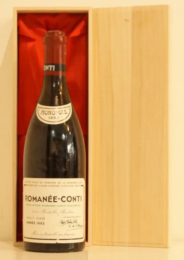 1993年 フランス産1993年 DRC ロマネ・コンティのヴィンテージワイン。贈り物やギフトに最適な、格調高い生まれ年ワインです。大切にされたボトル入りのお花が箱に包まれた本品は、特別な贈り物としてきっと喜ばれます。