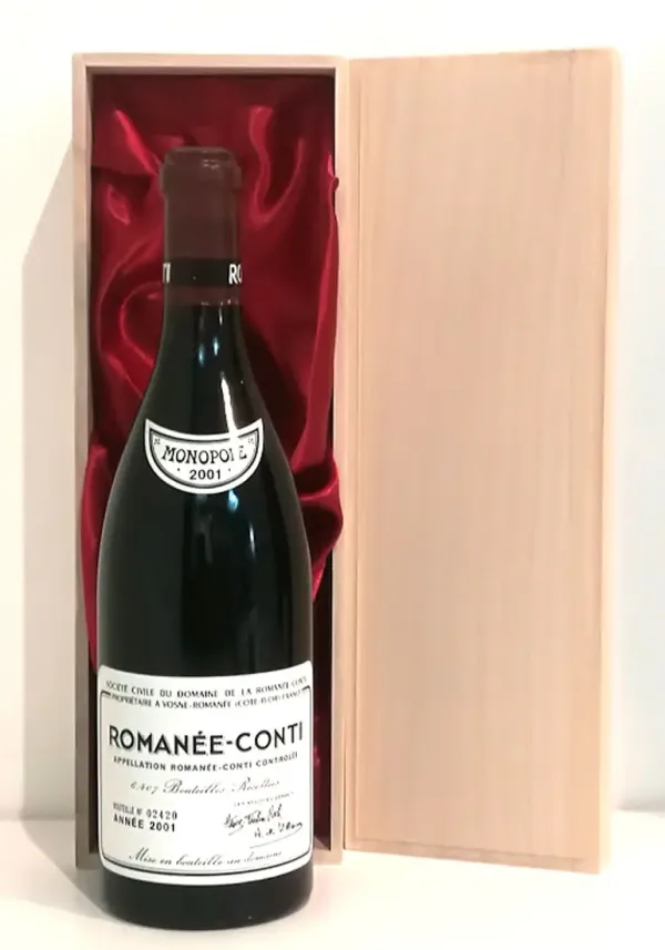 2001年 フランス産2001年 DRC ロマネ・コンティのヴィンテージワイン。贈り物やギフトに最適な、格調高い生まれ年ワインです。大切にされたボトル入りのお花が箱に包まれた本品は、特別な贈り物としてきっと喜ばれます。